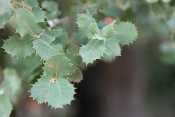 Presenta hojas simples, alternas, persistentes, duras, con una adaptación a medios secos presentando cutículas gruesas para evitar la pérdida de agua durante épocas secas. Presenta una clara diferencia entre un haz verde oscuro, glabrescente y liso, y un envés verde pálido, al final grisáceo, por el tomento corto y denso que le protege de la evaporación.