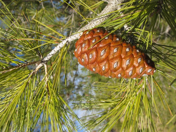 Las acículas normalmente aparecen envainadas de dos en dos. Son finas y flexibles, de longitud larga de entre 6 y 12 centímetros, tienen un color verde claro y persisten en el árbol poco más de dos años. Florece de Marzo a Mayo y las piñas alargadas de entre 6 a 12 centímetros están maduras al final del segundo verano. Es muy característico y distintivo de la especie la persistencia de las piñas en el árbol durante varios años, aún abiertas.